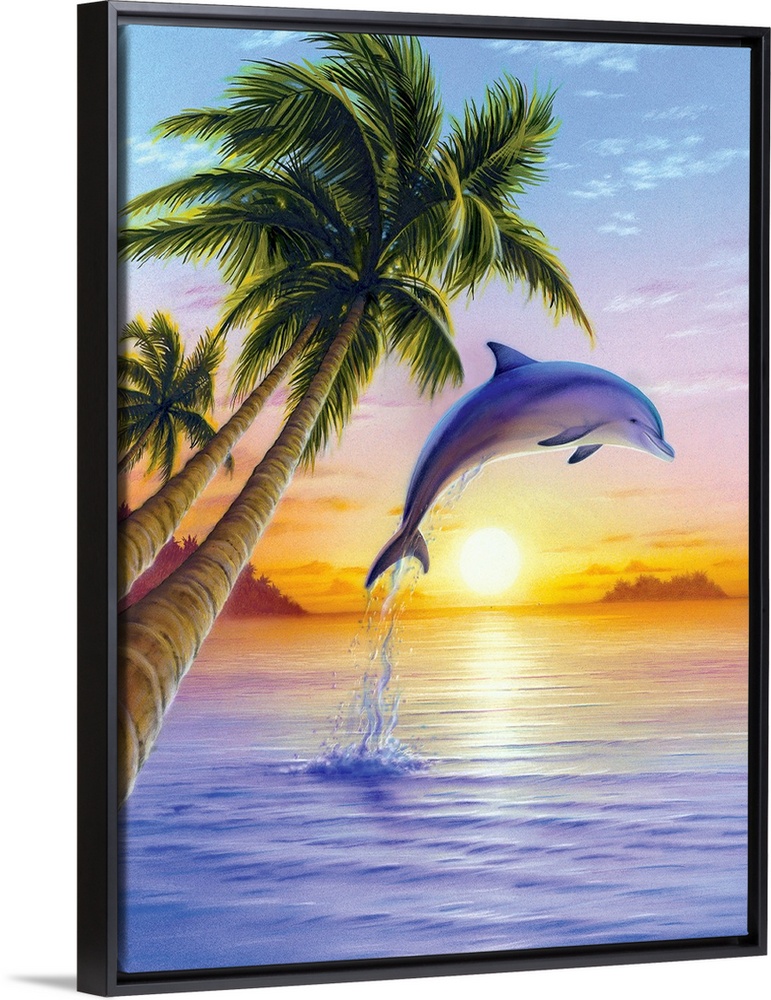 <p>Colorful bright artwork of porpoise jumping out of water at sunset with palm trees in the foreground.</p>