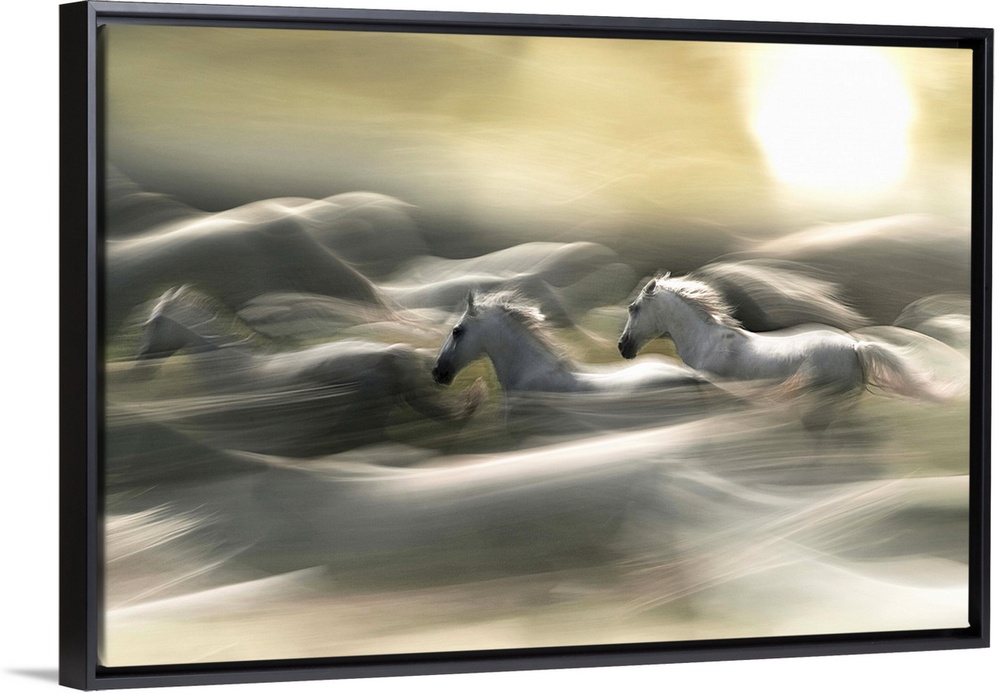 <p>White horses in a fiery blur of a gallop.</p>