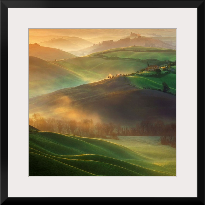 <p>A Tuscan countryside landscape bathed in early morning light and low lying fog.</p>