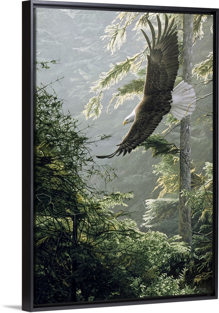 <p>An eagle soars above a forest, the morning light shining on the leaves.</p>