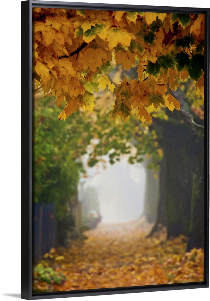 <p>A foggy sidewalk and trees covered with autumn leaves.</p>