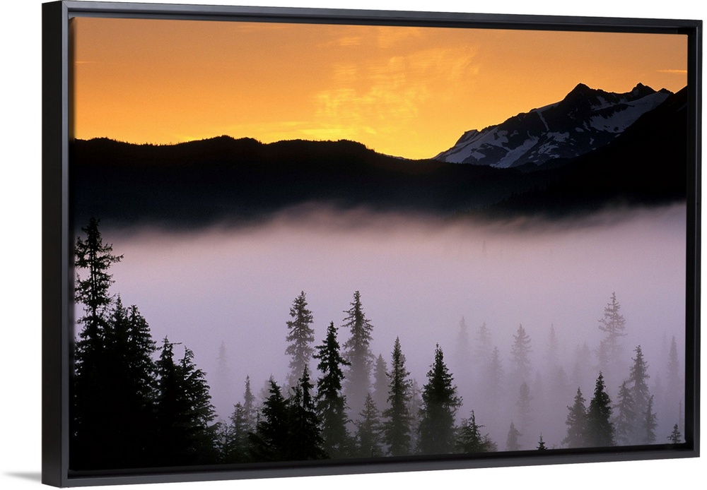 <p>Rising fog along Snow River tinted orange at sunrise, Seward Highway below Paradise Peak, Chugach National Forest, Alaska</p>