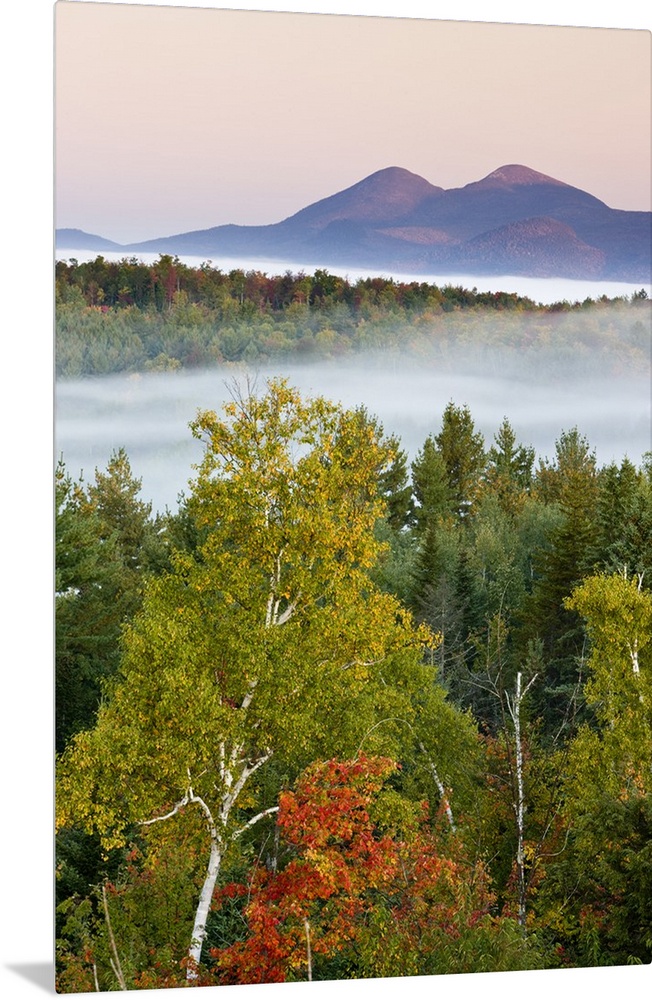 <p>Morning fog and the Percy Peaks as seen from the fire tower at Milan Hill State Park in Milan, New Hampshire.</p>