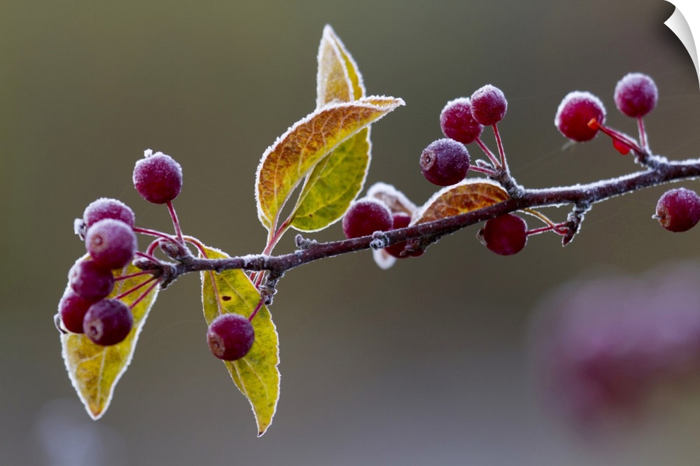 <p>Morning frost on a bing cherry branch (Prunus avium); New York, United States of America</p>