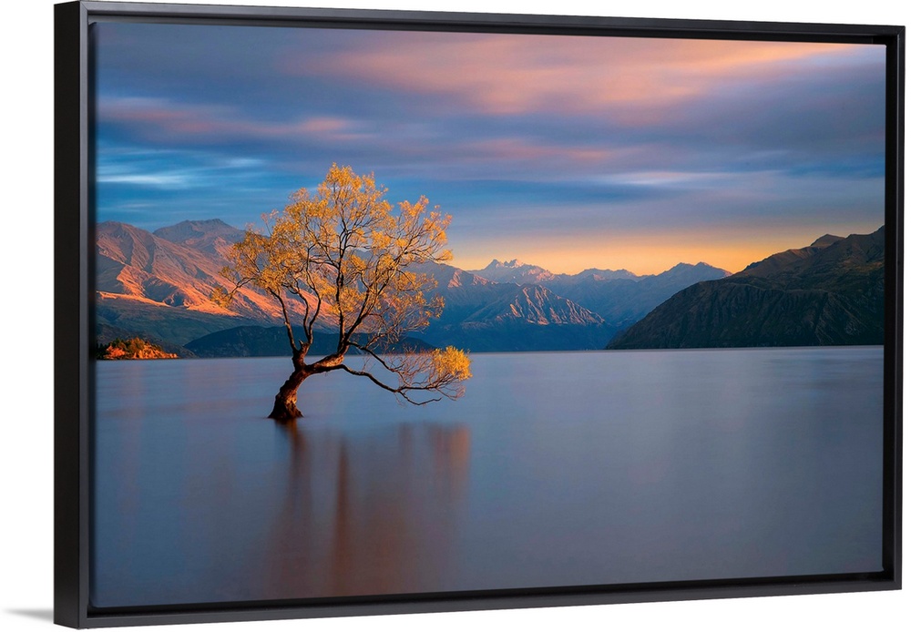 <p>Landscape photograph of calm water and mountains with a yellow leafed tree at sunrise in Wanaka, New Zealand</p>