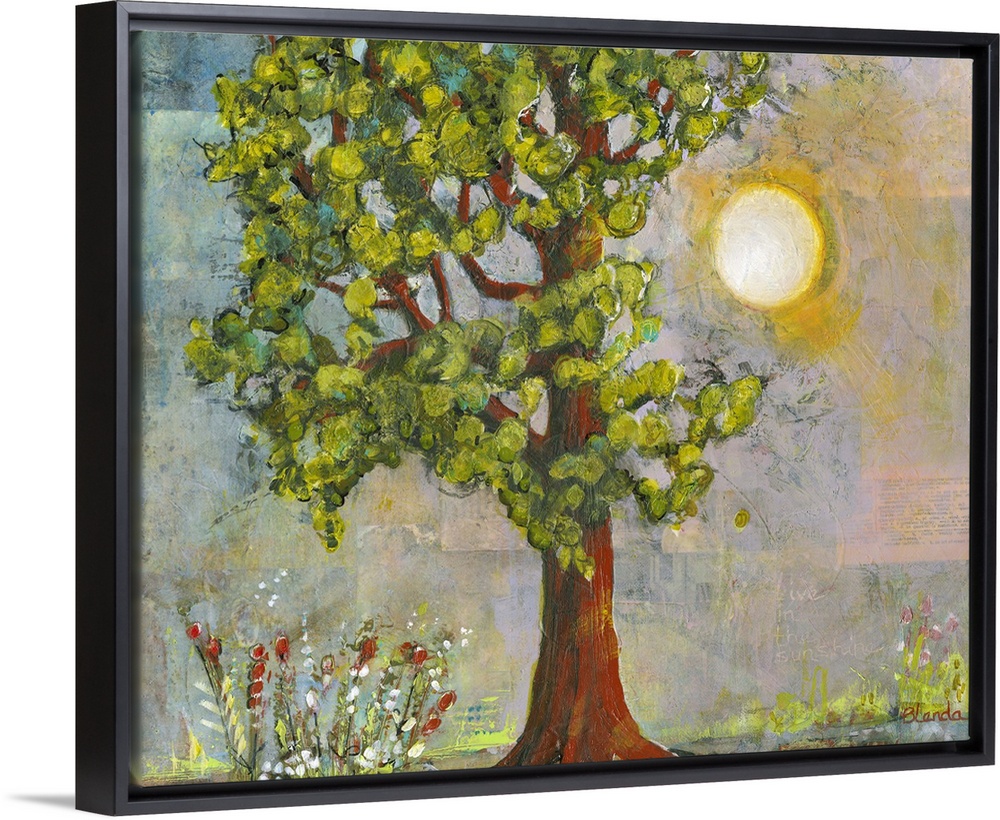 <p>Lighthearted contemporary painting of a tree with a rising sun behind it.</p>