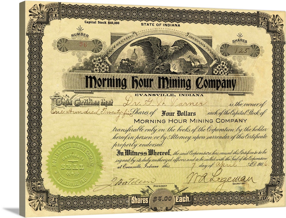 <p>Stock certificate for 125 shares of the Morning Hour Mining Company of Evansville, Indiana, sold to Dr. G. N. Varner for $500. on April 7, 1906.</p>