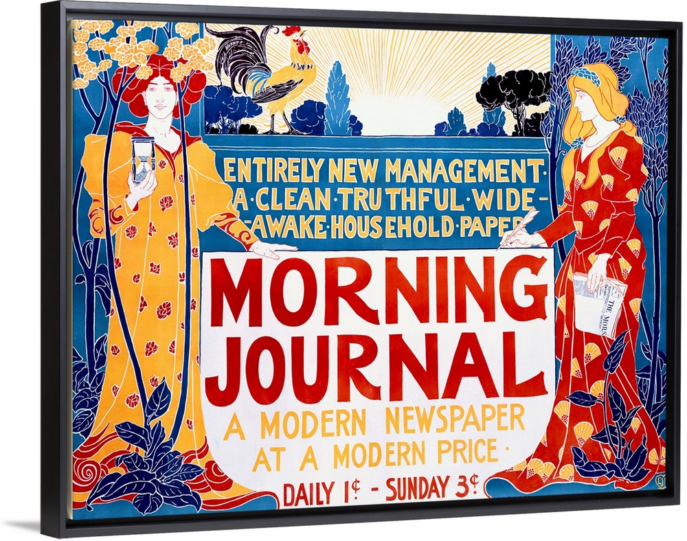 <p>Advertisement for local newspaper. Rhead always paid close attention to the decorative side of poster design, and we can discern this in the minutely detailed patterns on the women's dresses, the rooster's feathers, and even the veins on leaves. It all adds up to virtually all the ingredients of art nouveau, which was just then coming into vogue. Rhead was the only American artist to achieve the distinction of having a solo exhibition of his poster work both in London (1896) and in Paris (1897). Unexpectedly, even after all that accolade, Rhead eased his way out of posters after 1900, preferring to stay with illustrations.</p>