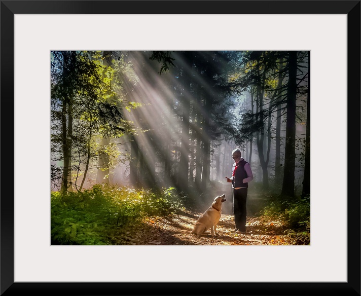 <p>A person and their dog standing in the sunlight in a forest.</p>