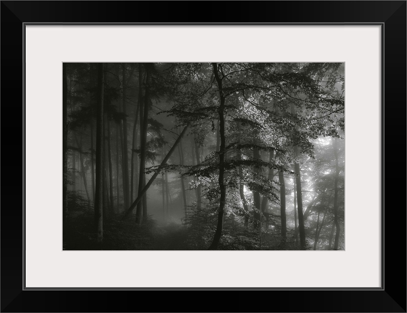 <p>Black and white image of a dark forest with light shining through the mist.</p>