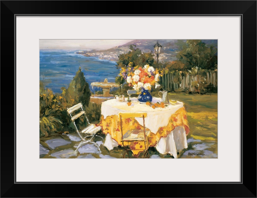 <p>Fine art oil painting landscape of a seaside cobblestone terrace with a table for two complemented by a blue vase filled with fresh cut flowers by Allayn Stevens.</p>