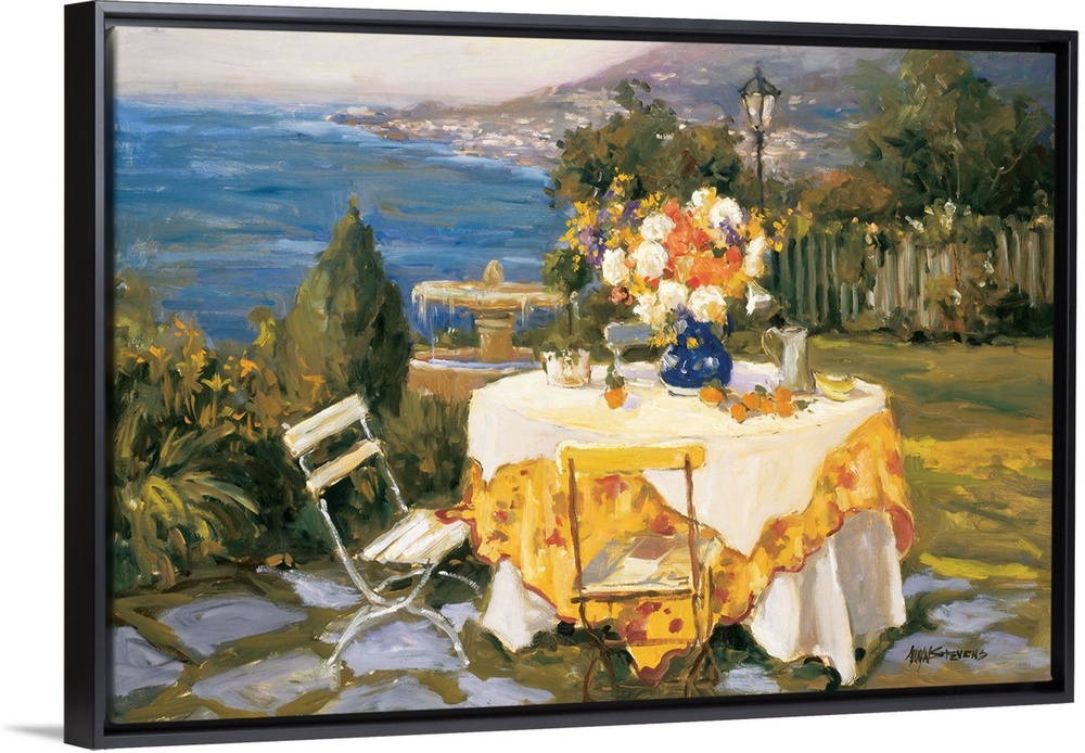 <p>Fine art oil painting landscape of a seaside cobblestone terrace with a table for two complemented by a blue vase filled with fresh cut flowers by Allayn Stevens.</p>