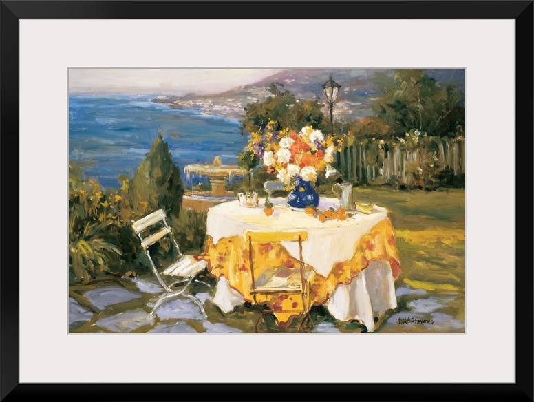 <p>Fine art oil painting landscape of a seaside cobblestone terrace with a table for two complemented by a blue vase filled with fresh cut flowers by Allayn Stevens.</p>