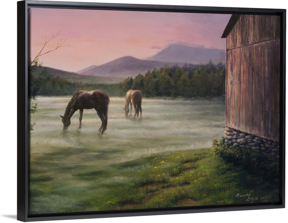 <p>Contemporary painting of horses grazing in the morning mist.</p>