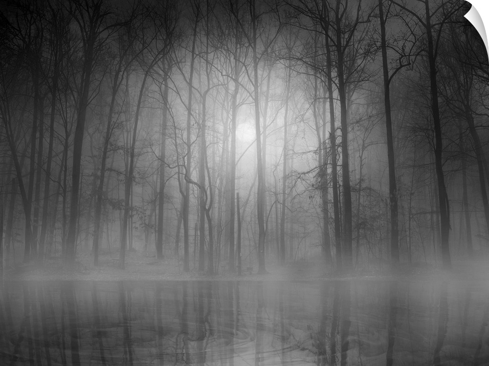 <p>An eerie foggy forest scene casting its reflection in the water below.</p>