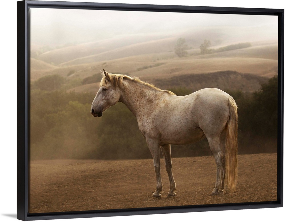 <p>Photograph of a white horse standing in the morning mist by Sally Linden.</p>