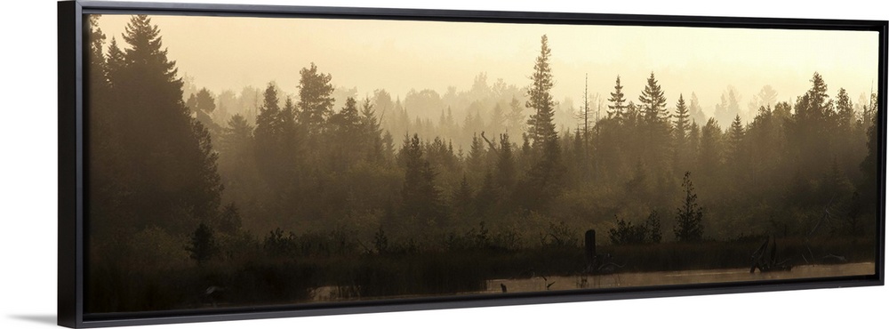 <p>Morning mist at sunrise over the woods in northern Maine, as seen from a kayak on Spencer Pond.</p>