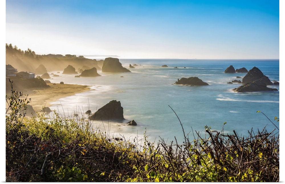 <p>Morning mist rising from Harris Beach, near Brookings, Oregon. The rock formations add to the views looking out at the Pacific Ocean; Oregon, United States of America</p>