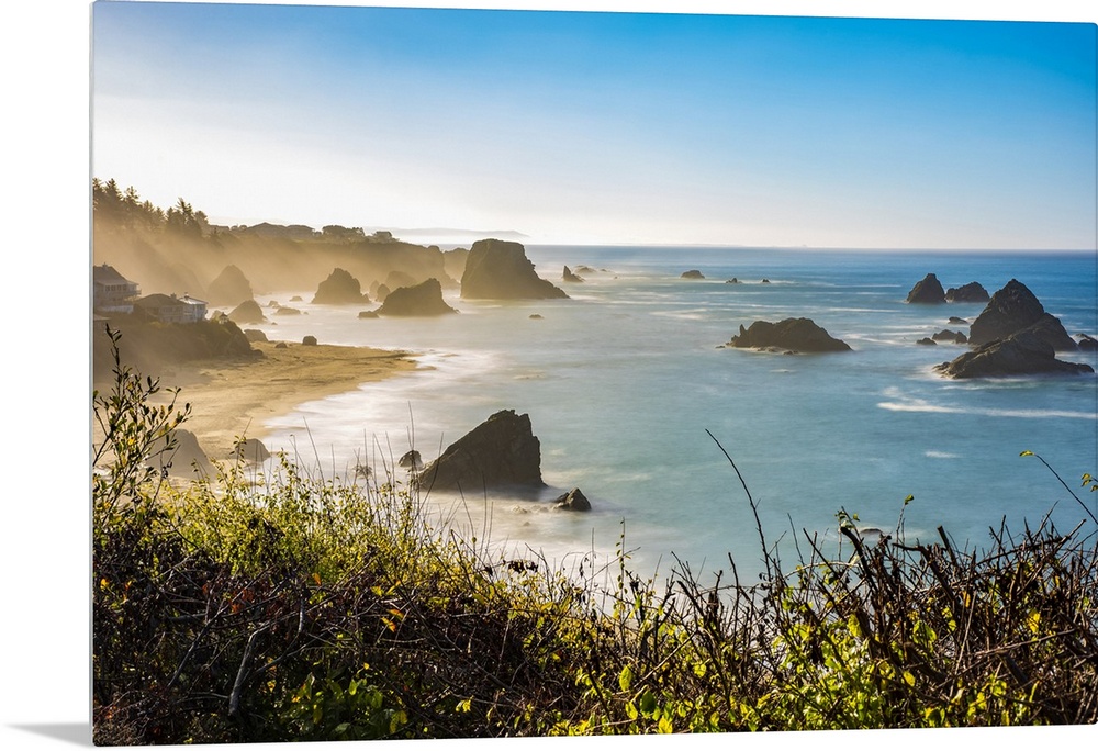 <p>Morning mist rising from Harris Beach, near Brookings, Oregon. The rock formations add to the views looking out at the Pacific Ocean; Oregon, United States of America</p>