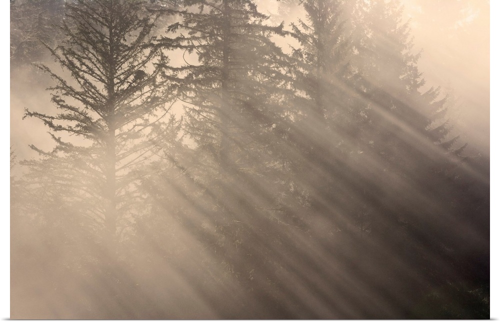 <p>Morning rays shine through the mist and spruce and hemlock trees Tongass national forest southeast, Alaska, autumn.</p>