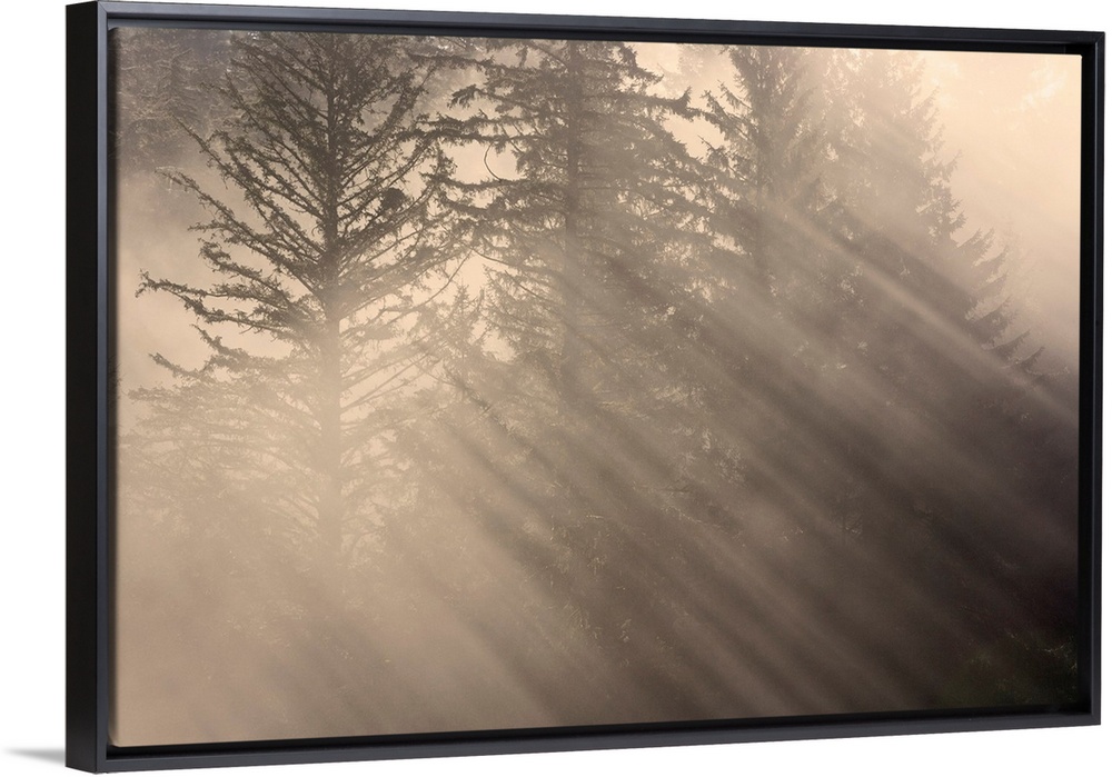 <p>Morning rays shine through the mist and spruce and hemlock trees Tongass national forest southeast, Alaska, autumn.</p>
