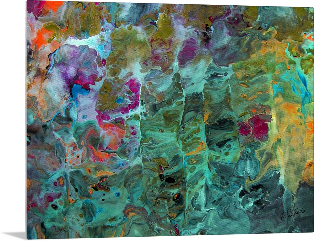 <p>Contemporary abstract painting using sea green tone surrounded by shades of purple red and yellow resembling a close-up view of an intricate geode.</p>