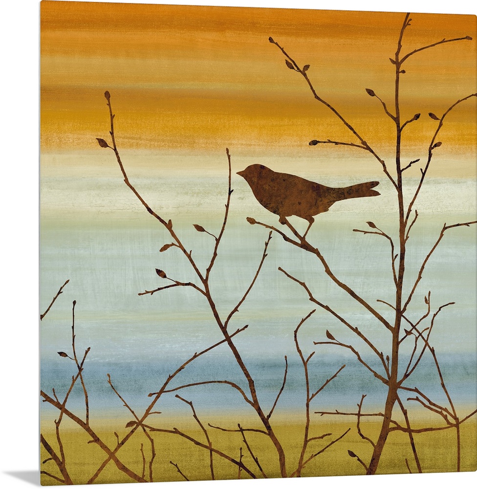 <p>Square decor with silhouettes of a bird and Winter branches on a warm and colorful background.</p>