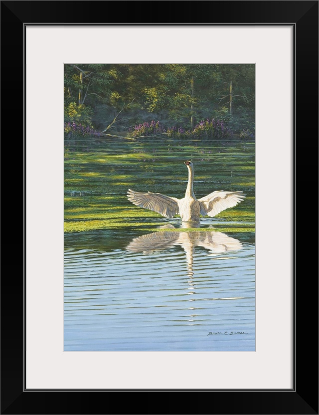 <p>Contemporary artwork of a Swan stretching out wings in the water purple flowers and forest in back</p>