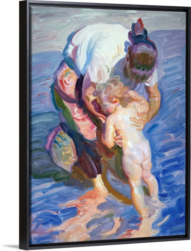 <p>Painting of a mother holding her child in the ocean water.</p>