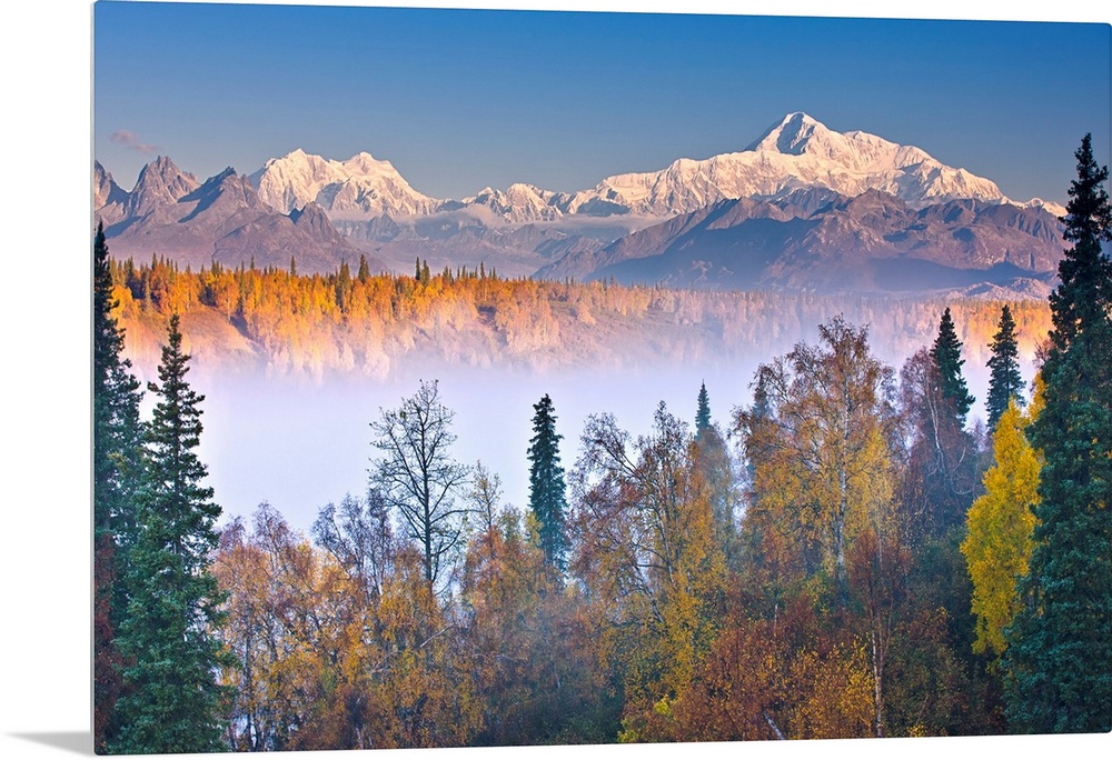 <p>The early morning sun lights up Mount McKinley, and the Alaska range as fog covers the Chulitna River valley, photographed from the Denali South Overlook along the Parks Highway in Denali State Park, Fall foliage, Alaska, USA.</p>