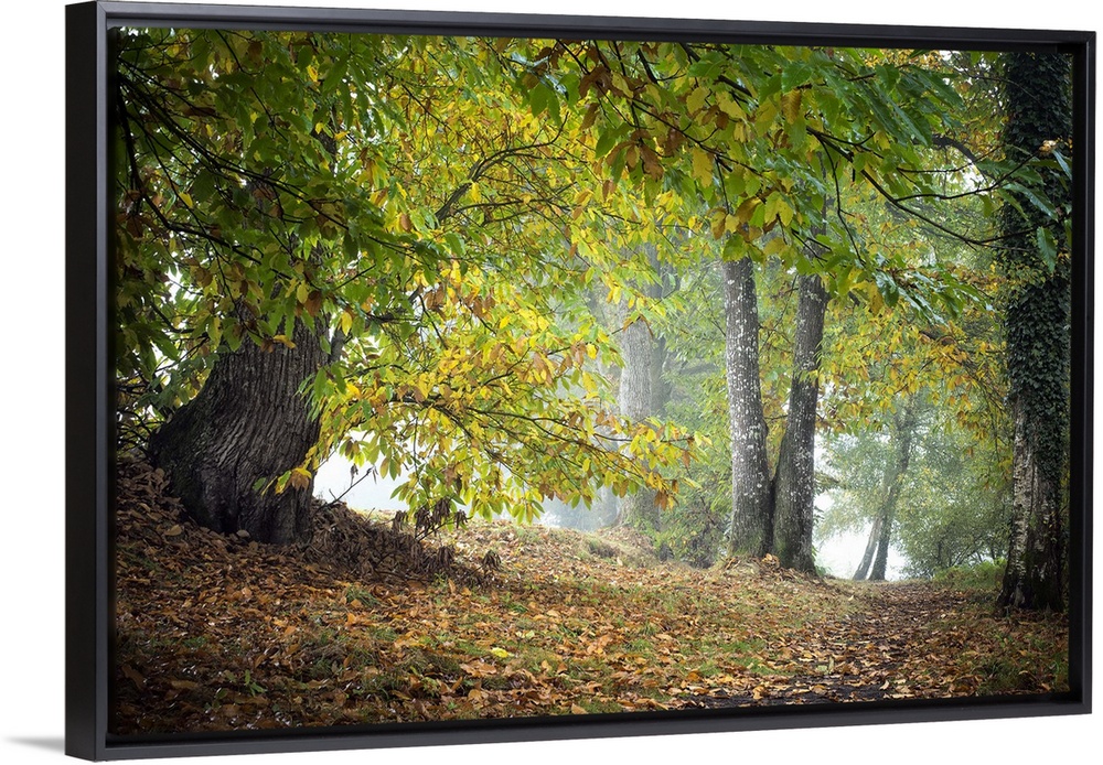 <p>Forest view at fall with huge oak tree on the side with yellow leaves, a path crossing going away.</p>