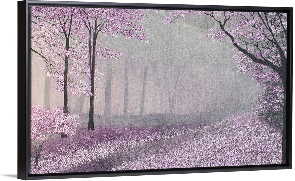 <p>Forest landscape with pink, white, and purple leaves in the trees and covering the ground with a foggy appearance.</p>