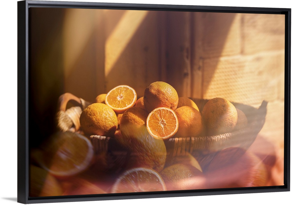 <p>Composited photograph of a woven basket filled with oranges in the morning sunlight.</p>