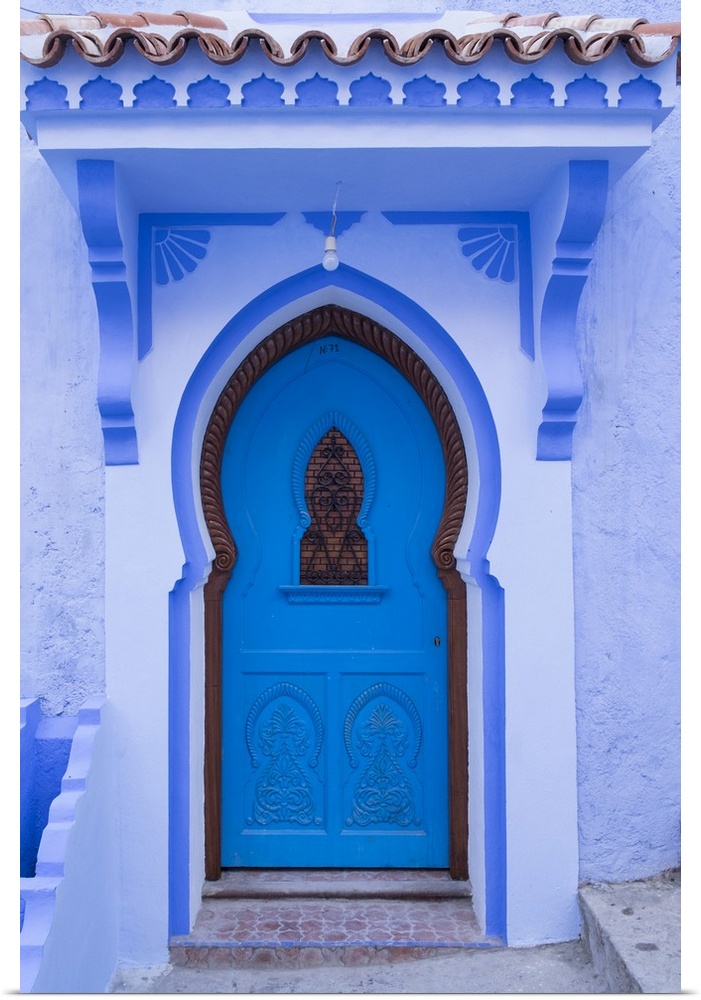 <p>Morocco, Chefchaouen. A traditional door and entrance to a home in the village.</p>