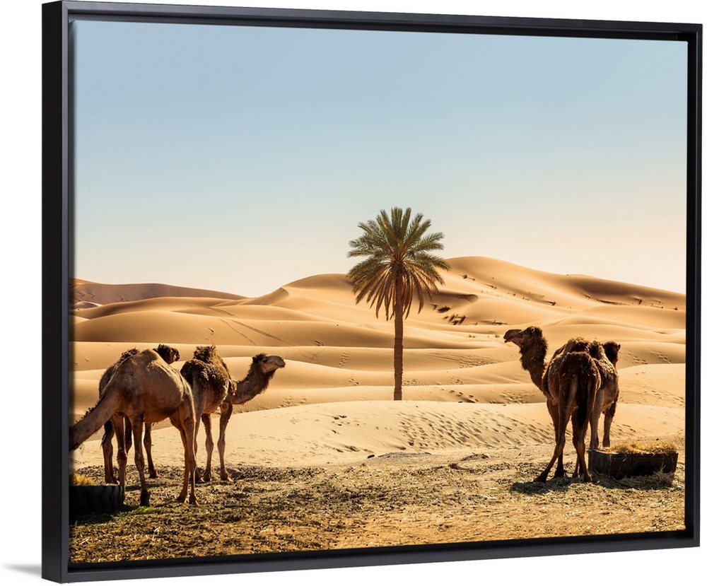 <p>Morocco, South Morocco, Erg Chebbi Desert, Merzouga, Dunes d'Erg Chebbi. Camels and palm tree in the dunes in the early morning light.</p>