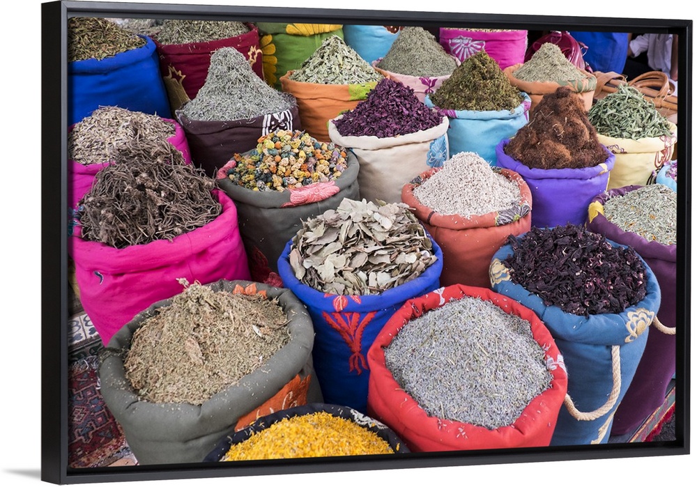 <p>Morocco, Marrakech. Bags of herbs, spices and dried floral and vegetable items in the souk.</p>