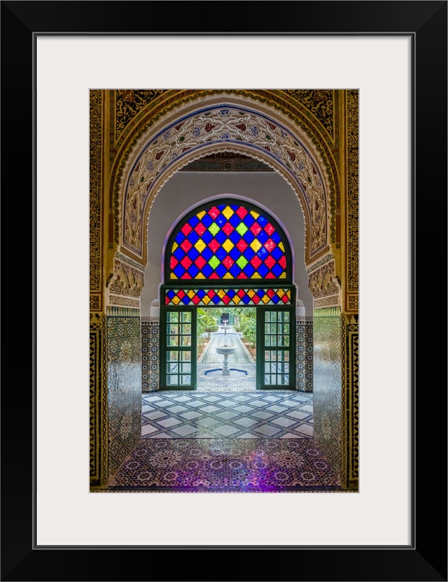 <p>Morocco, Marrakech-Safi (Marrakesh-Tensift-El Haouz) region, Marrakesh. Interior archway with view to gardens at Bahia Palace (Palais de la Bahia).</p>