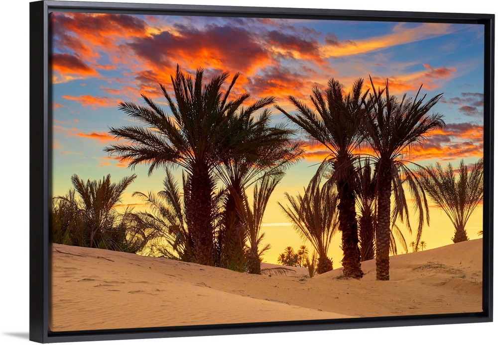 <p>Morocco, South Morocco, Sahara Desert, Erg Chebbi Desert, Merzouga, Palm trees at sunset.</p>