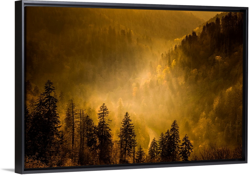 <p>Golden sunlight in a misty valley in the Blue Ridge mountains.</p>