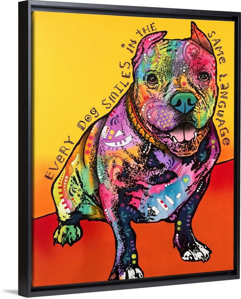 <p>"Every Dog Smiles in the Same Language" handwritten around a colorfully painted pit bull on a yellow and orange background.</p>