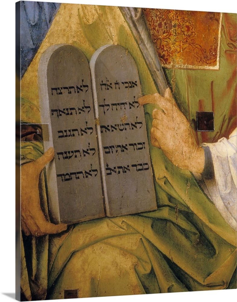 <p>Justus of Ghent, Joos van Wassenhove (1435-1480). Moses. 1470s. Detail of the Tables of the Law. Flemish art. Oil on wood. ITALY. Urbino. Ducal Palace. -</p>