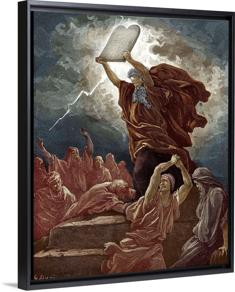 <p>Moses breaks the tablets of the law after coming down from Mount Sinai and finding the children of Israel worshipping the golden calf: 'Moses ' anger waxed hot, and he cast the tables out of his hands, and brake them beneath the mount.' (Exodus 32 : 19 - 20). Drawn by Gustave Dore, French artist, b January 6, 1832 - January 23, 1883. Engraved by Hotelin.</p>