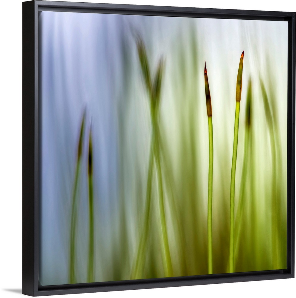 <p>Big square artwork with a closeup of two moss grass blades with a blurred grass and sky background in cooling tones. Two moss grass blades are in focus and contrast with the muffled, out of focus background.</p>
