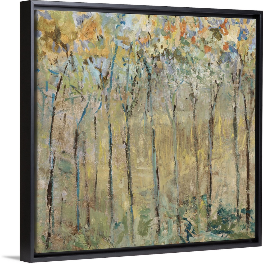 <p>Contemporary artwork of a forest of thin trees with colorful leaves.</p>