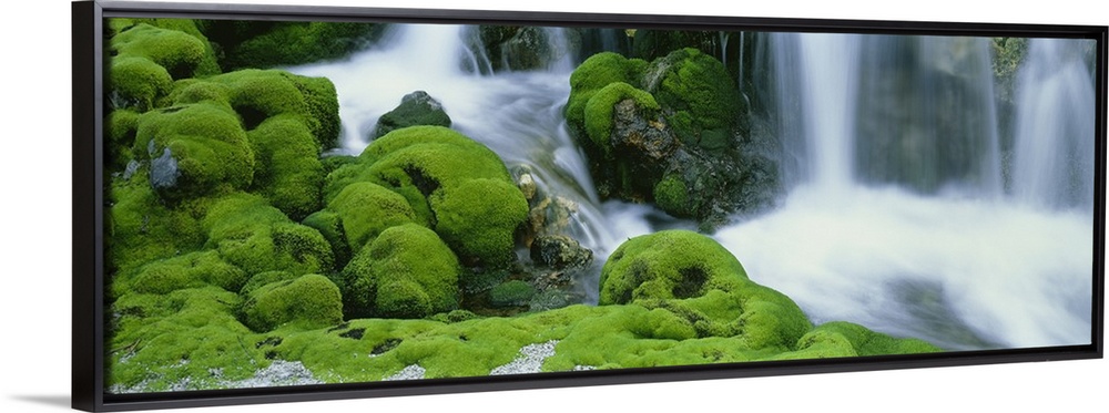 <p>Oversized, horizontal photograph of a stream rushing through large, rocky terrain covered in thick moss. A waterfall pours into the stream, in Gunma, Japan.</p>