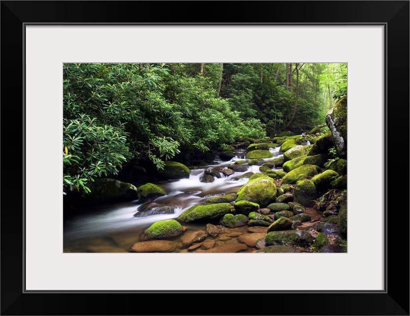 <p>A time lapsed landscape photograph of a stream passing through round moss covered boulders in a forest deep in the southern Appalachian Mountains.</p>