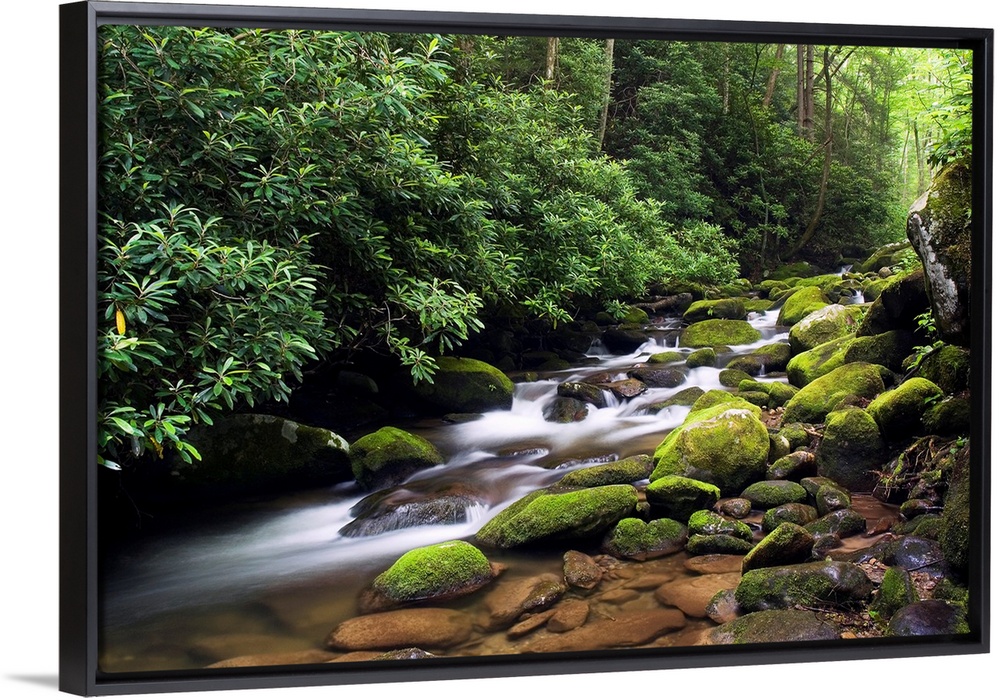<p>A time lapsed landscape photograph of a stream passing through round moss covered boulders in a forest deep in the southern Appalachian Mountains.</p>