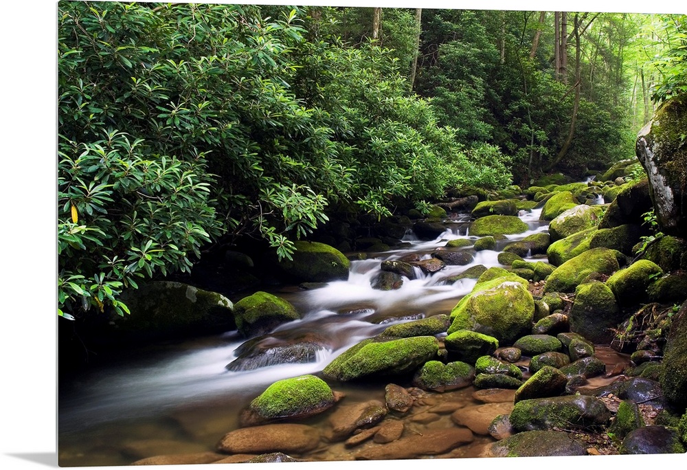 <p>A time lapsed landscape photograph of a stream passing through round moss covered boulders in a forest deep in the southern Appalachian Mountains.</p>