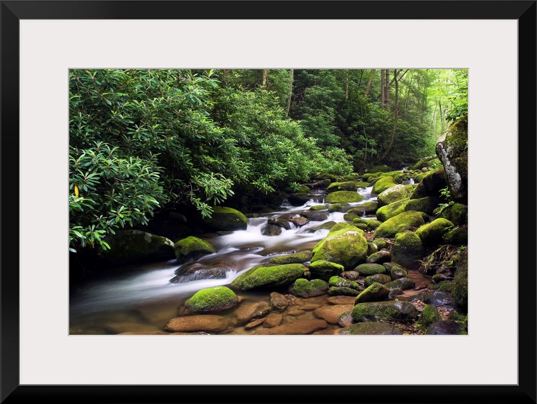 <p>A time lapsed landscape photograph of a stream passing through round moss covered boulders in a forest deep in the southern Appalachian Mountains.</p>