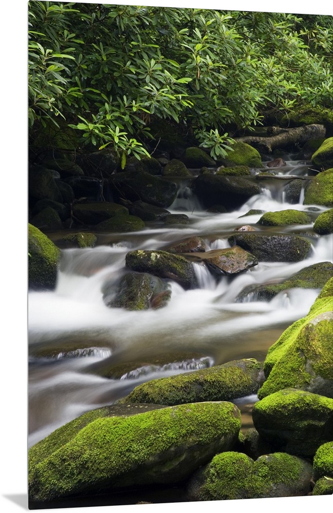 <p>Giant photograph shows fast-moving water traveling down a stream and over rocks of varying sizes, some of which have a small flowerless plant attached to the tops of them. On the bank of the stream are groups of trees plentiful with healthy leaves.</p>
